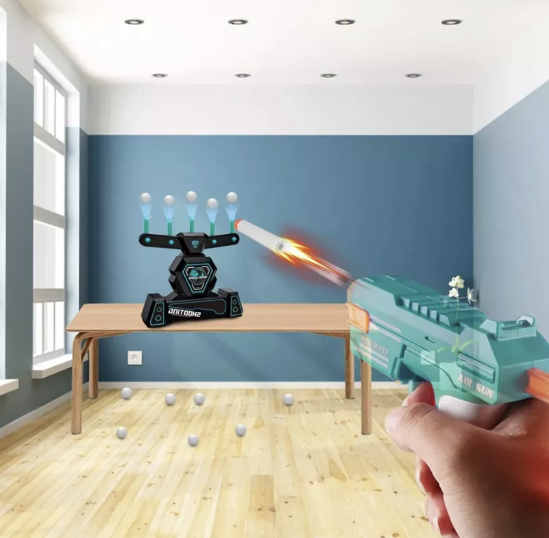 El juguete utiliza una base propulsada por aire que hace levitar discos o bolas ligeras, simulando una diana en movimiento - lista para ser golpeada con dardos, flechas o pistolas de juguete (según el modelo).